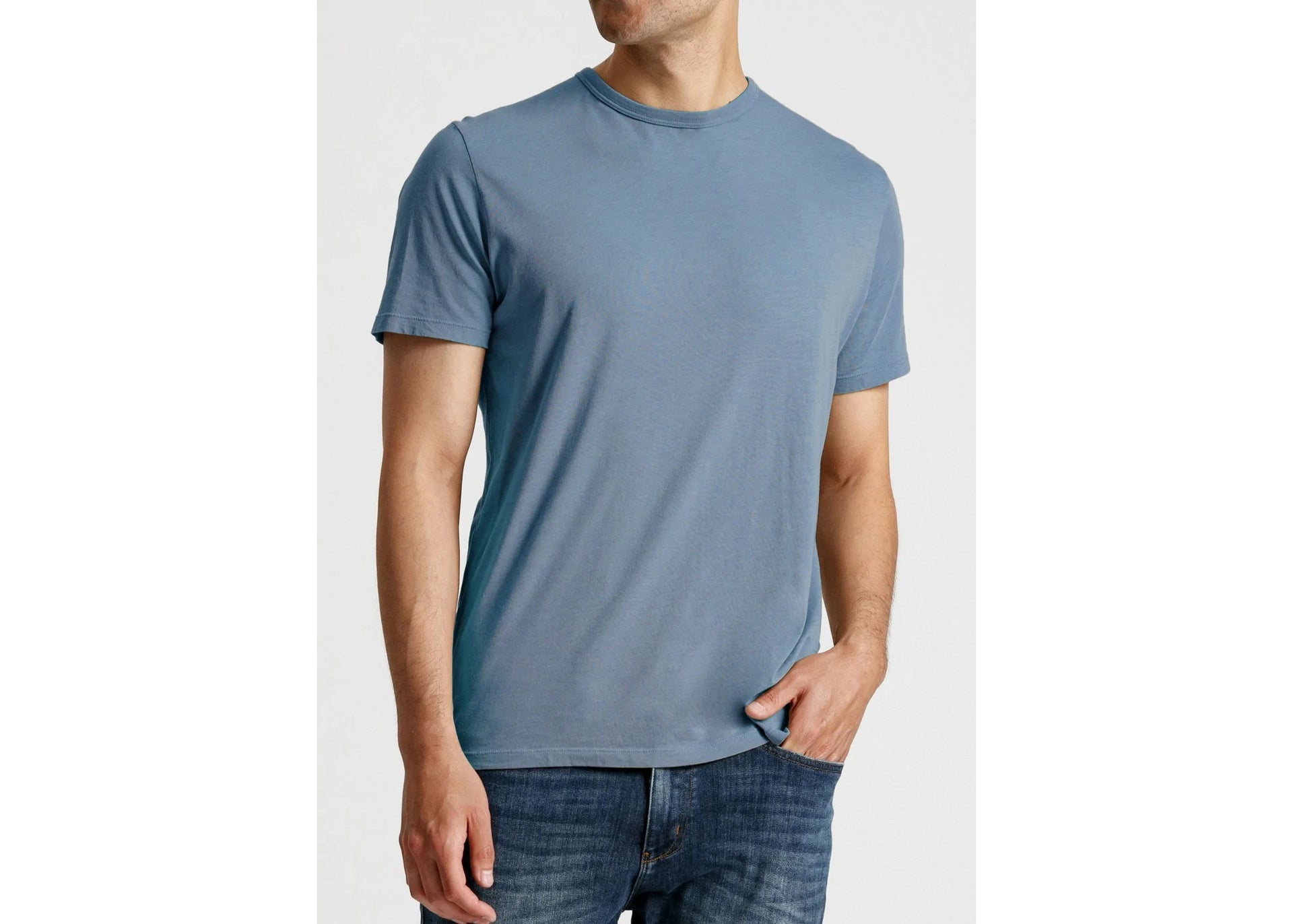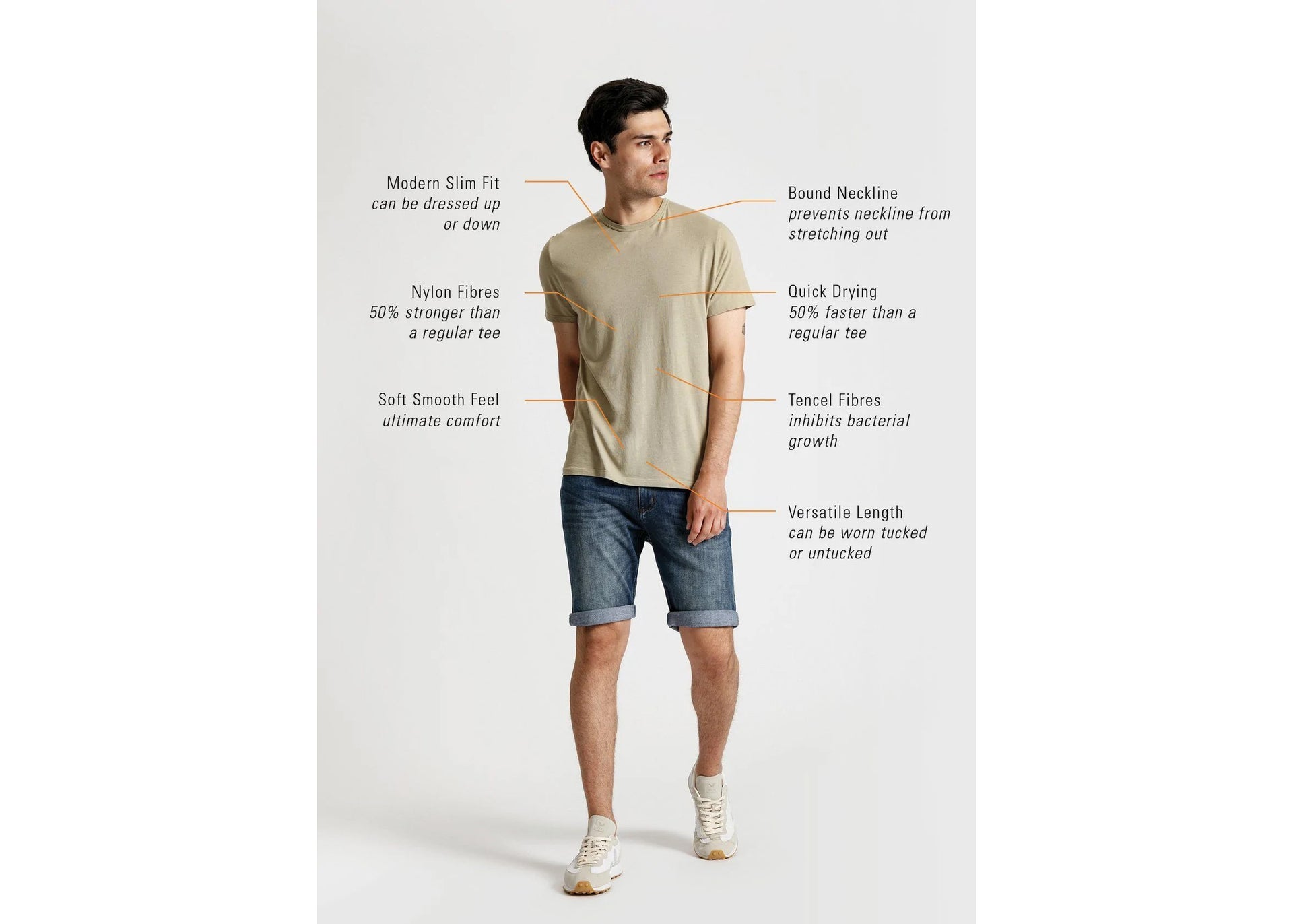 A slim modern fit with a bound neckline results in the look and feel of a sophisticated high-end tee with built-in performance capabilities.